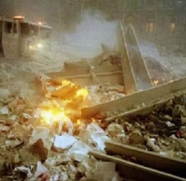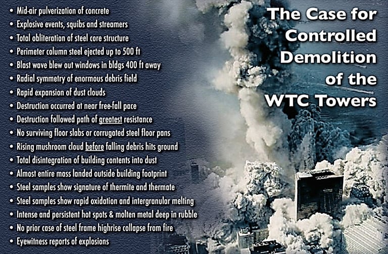 Molten puddles of steel were found in the debris but airplane fuel does not burn hot enough to melt steel. The heat had to have been caused by something else. There is evidence the towers were rigged for demolition and directed energy was used to disintegrate or dustify the buildings and vehicles in the vicinity.