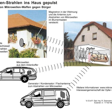 In the picture you can see a person sleeping in their home being attacked with microwave radiation from a system that uses a magnetron, an antenna and a generator directing energy to make a microwave field around the person. This can be done using vehicles parked near a person's home or from installations in or on buildings.