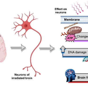 Figure 6. Representation of microwave radiation effects on the brain. Microwave radiation induces protein damage in neurons, changes mitochondrial activity by influencing the formation of ROS and ATP levels, and causes breaks in single- and double-strained DNA, which leads to brain dysfunction and declines in spatial memory.