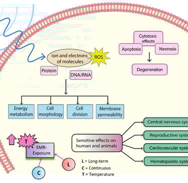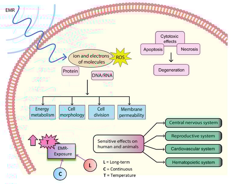 Figure 2. A generalized representation of the interactions between EMR and biological systems, with common effects. The EMR has an impact on molecular ions and electrons, as well as ROS, protein, and DNA/RNA levels. Furthermore, the EMR has cytotoxic effects on cells by causing degeneration, apoptosis, and necrosis. EMR has a strong impact on the central nervous system, reproductive system, cardiovascular system, and hematological system. Furthermore, the constant and long-term exposure of EMR to a biological system raises tissue temperature, which is a frequent effect of different stimuli.