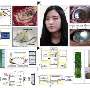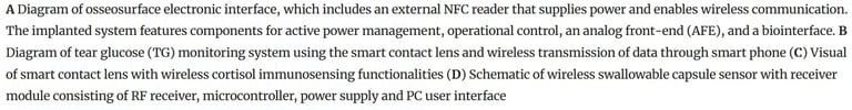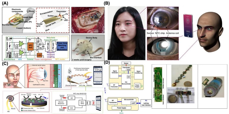 One emerging application of implantable wireless sensors is osseosurface electronics, an implementation in which wireless sensing devices are implanted and adhered directly to bone surfaces [168]. These battery-free devices are equipped with multimodal capabilities, including sensors for real-time bone strain measurement, millikelvin resolution thermography, and optical stimulation. They operate wirelessly through energy harvesting and data transmission, eliminating the need for internal batteries. The devices are permanently bonded to the bone using calcium phosphate ceramic particles, demonstrating stable integration and functionality in deep tissue environments. The system features a hybrid integration of a flexible substrate with miniaturized components for analog and digital functions, enabling conformal attachment to the bone while maintaining stability and minimizing strain on the target sensing region. The device utilizes magnetic resonant coupling (13.56 MHz) for wireless, battery-free power harvesting through thick tissues up to 11.5 cm. The system operates using NFC-compatible hardware, featuring a compact NFC system-on-chip (4 mm × 4 mm) that integrates a microcontroller and transponder for operational control (Fig. 7A). The analog front-ends (AFE) for strain and temperature sensing are optimized for low power consumption and high sensitivity.