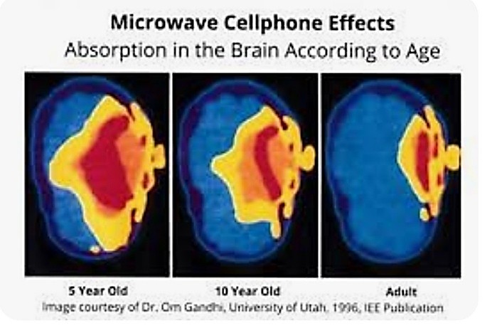 A study published in 2018 revealed that a child’s brain absorbs 2-3 times more radiation than an adult’s, particularly when a cell phone is position next to the ear or in front of the eyes to view virtual reality.1 Similarly, an earlier study reported that, “in general and on average, children suffer a higher exposure of their brain regions than adults” because children have proportionally smaller heads and brains, yet receive the same levels of cell phone radiation as adults.2 The American Academy of Pediatrics agrees, saying that “when used by children, the average RF energy deposition is two times higher in the brain and 10 times higher in the bone marrow of the skull, compared with mobile phone use by adults.”3