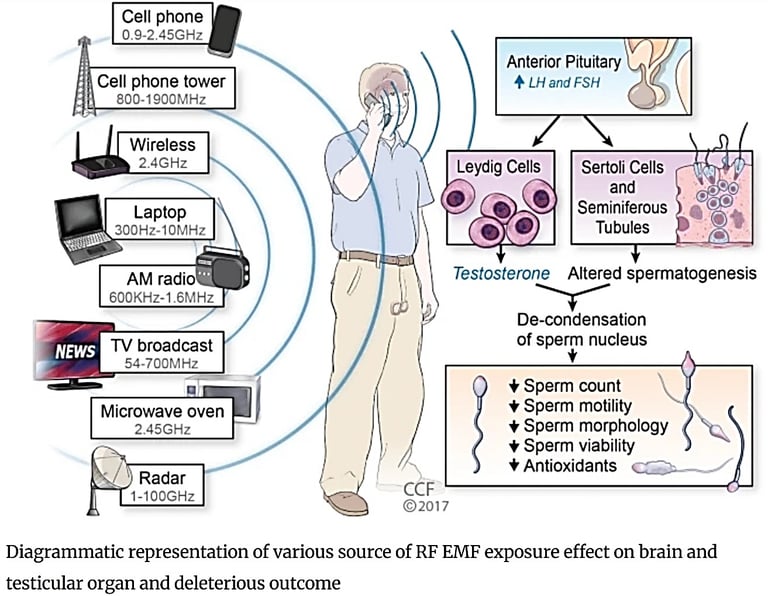 The frequencies in the range of 100 kHz to 300 GHz refer to RF and represent only a part of the electro-magnetic spectrum. Figure 1 shows the sources of radiofrequency electromagnetic field (RF-EMF) exposure affecting sperm parameters. In the list of new technologies, intermediate frequency (IF) has been listed as newest source of exposure to electro-magnetic fields. This frequency range falls between the low frequency (low frequency- 0.1 Hz–1 kHz) and the radio frequency (RF) (10 MHz–300 GHz). Major sources of this range are airport security scanners and anti-theft devices operated at the exits of shops.https://link.springer.com/article/10.1186/s12958-018-0431-1