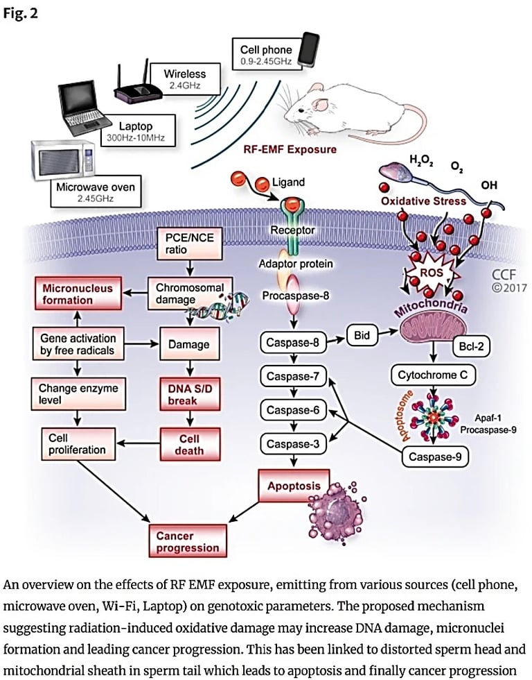 Many in vitro and in vivo studies showed that EMF induced genotoxic single- and double-strand DNA breaks, micronucleus formation, chromosomal abbreviations, changes in gene expression, cell proliferation and apoptosis [25, 26, 94,95,96,97]. Such changes are responsible for genomic instability and promote tumorigenic effect in cells. We explore the genotoxic effect of RF EMF on sperm parameters and possible infertility outcome as discussed below and which is also represented in Figure 2.