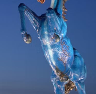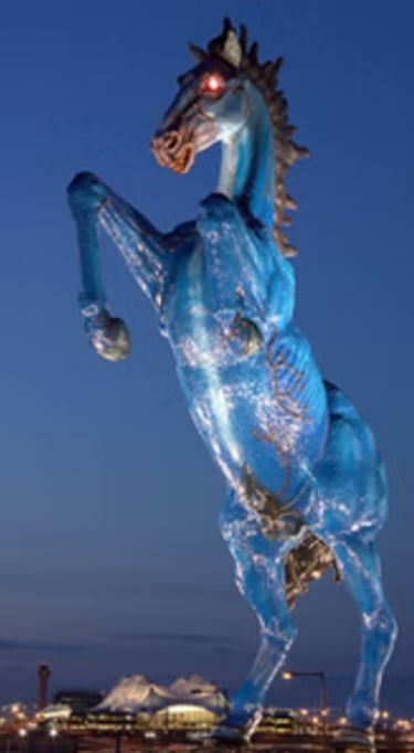 Standing 32 feet tall and molded from polychromed fiberglass, the mustang is painted a vibrant blue with red, glowing neon eyes. Meant to represent the “wild” spirit of the old American West, Jiménez installed the glowing eyes as homage to the neon workshop he worked in as a youth. These glowing eyes have earned the sculpture the nickname "Blucifer."