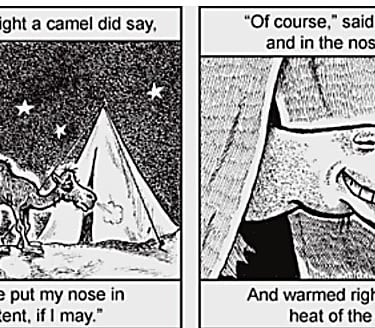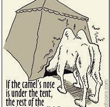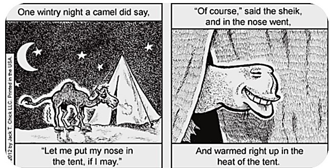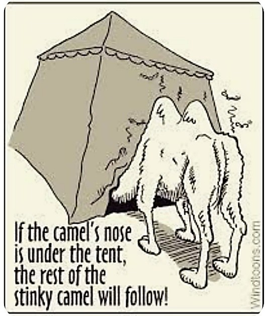 The metaphor comes from a story about an Arab and his camel. During a cold night, the camel, feeling the chill, asks to only put its nose into the tent to get warm. The owner agrees, but soon the camel asks to put its head in, then its shoulders, and so on, until the entire camel has forced its way inside and taken over the tent, leaving the owner out in the cold.