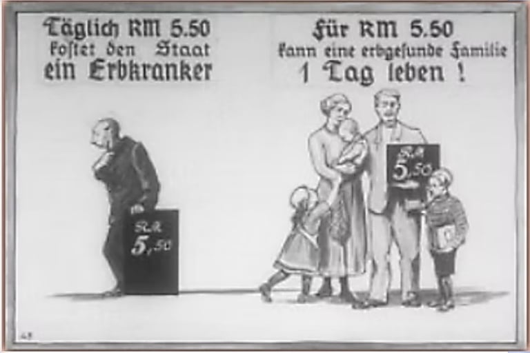 This is an illustration from 1945 comparing the amount of money it takes to support one mentally or physically handicapped person to the amount of money it takes to support this whole family.