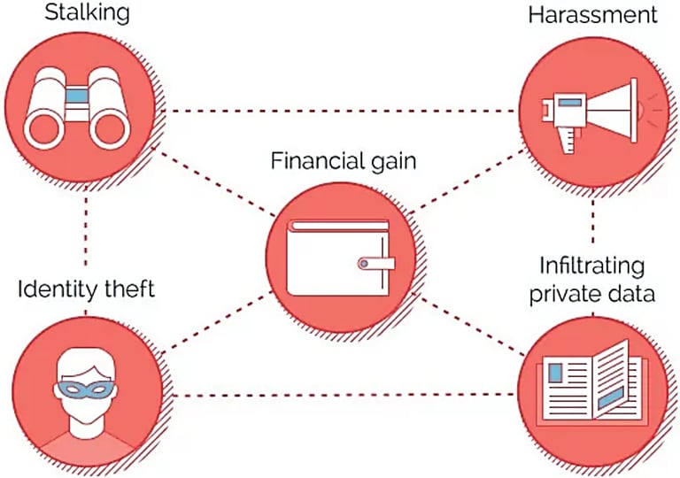 Doxing: Publishing a victim's private information (home address, phone number, family details, and employer information) online to encourage a "troll storm" of harassment and threats from others.