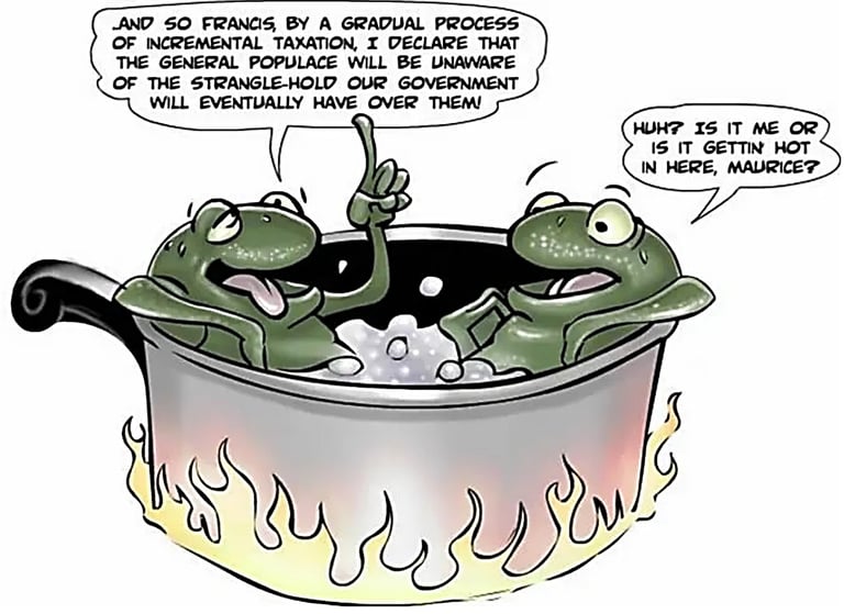 The conclusion being that if you put a frog immediately into boiling water, it will naturally jump free. By putting a frog into cool water, and gradually turning up the heat, the frog will never realize that he is being slowly boiled alive.
